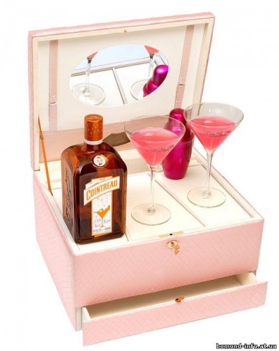 Коктейльный набор- будуар от Диты фон Тиз является девичьей розовой коробкой содержащей бутылку куантро, два бокала для коктейля и специально созданный шейкер. Эта коробка имеет зеркало и люк для сокрытия других сокровищ.