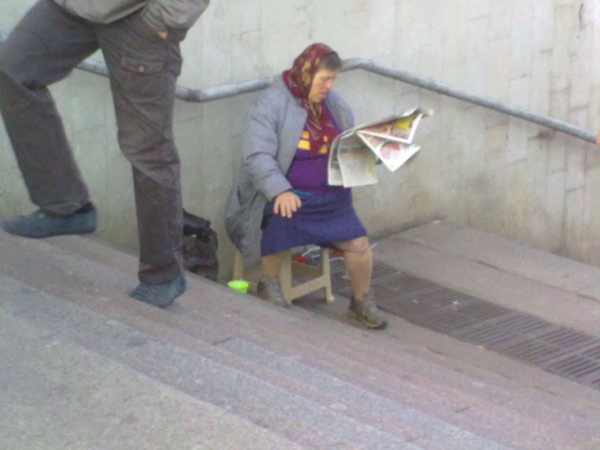 Это бабулька сидит возле часов Ориго в переходе. Каждое утро, как я прохожу мимо, она бросает мне одну и ту же фразу «Мальчик, помоги копеечкой».