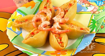 Нафаршировать ракушки начинкой и уложить в форму, смазанную маслом.