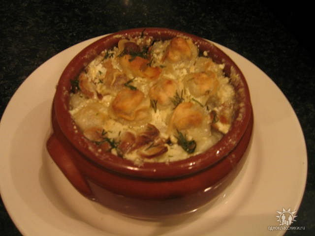Взять баночку шампиньонов в собственном соку (целые - чтобы красиво порезать). Или взять 200 гр свежих шампиньонов. Порезать их пластинками и обжарить на сл..масле и соединить с пельменями. Все переложить в порционные горшочки, залить немного овощным бульоном и сверху положить 1 ст.л. сметанки. Поставить в духовку 180-200 гр минут на 30. Перед подачей немного присыпать укропом.