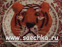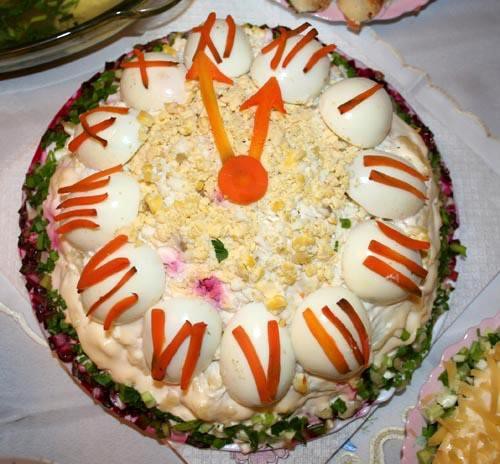 Верхний слой – морда "тигра". Кладем сначала оставшееся пюре, из оливок и полосок свеклы делаем "глаза", затем все остальное покрываем слоем тертой моркови. Белые пятна получаются из мелко натертого белка, нос, рот и темные полосы из – из свеклы. Салат готов.