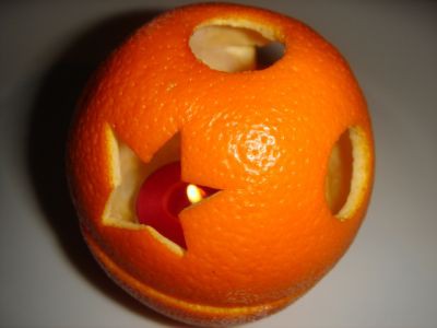 Толстокожий апельсин разрезать на две части - побольше для верха и поменьше для низа, аккуратно вынуть из корок мякоть и съесть для поддержания творческой мысли.