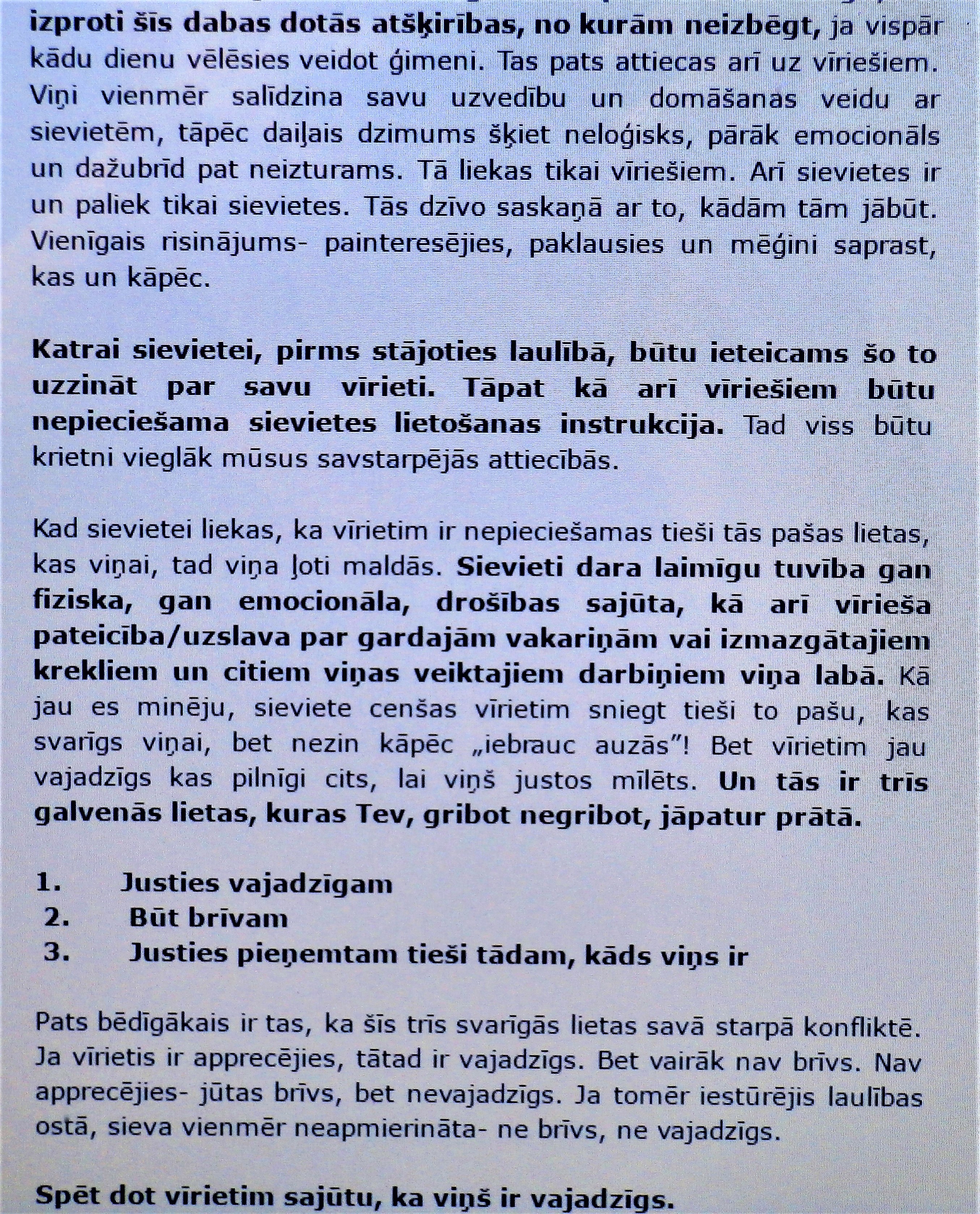 2. jūn 2017. 10:55Piekrītu, ka laiku laikos jau bijušas šīs atšķirības domāšanā,loģikā,emocionālajā sfērā starp abiem dzimumiem..bet vairāk sāk biedēt tieši šī psihologa pieminētā menedžmenta projektmīlestība.Tie ir arī mani vērojumi un tik tiešām piekrītu šim psihologa viedoklim, ka laiki mainās un mainās ne tikai tikumi,bet arī jūtu dziļums attiecībās.Ar vēsu nesatricināmu mieru atsien pušķīti,kas cieši saturēja kopā...un aizlido tālēs zilajās..vienkārši nesanāca..nekļuva saistoši vairs utt.Tas raksturīgs galvenokārt par mani jaunākiem cilvēkiem gan.