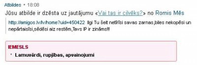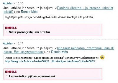 Vai jautājums (kā ir mīlēt ......) ietvēra kādus lamu vārdus vai kādu aizvainoja, ja tika dzēsts? Un vai atbildēs vajadzēja dažiem sarakstīties, vai tad sarakstei nau citas vietas ja pa vidu jāveic nesaprotama sarakste. Ļoti žēl par šādu dažu cilvēku rīcību!